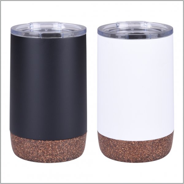 Vacuum, thermo double-wall 240ml capacity cup. Combination of base in natural cork and body in stainless steel in black or white. Double wall to keep drink fresh longer. Unique transparent finished lid with sipping slider. Packaged individually in white recyclable box. Do not use in microwave or oven and hand wash only. Colours: Black, White. Dimensions: 115mm x 73mm.