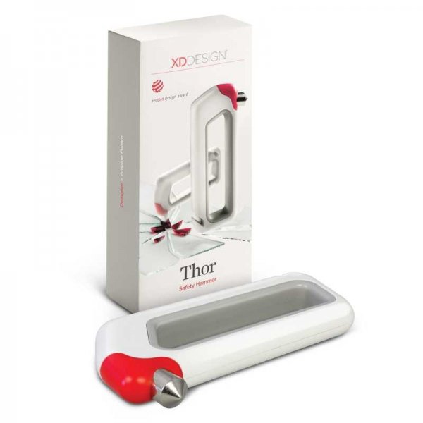 Practical car safety hammer and seat belt cutter which is nicely presented in a printed XD Design gift box. Colours: White/Red. Dimensions: Hammer: L 158mm x W 78mm x 25mm. Gift box: L 175mm x W 88mm x 35mm. Top - 35mm x 12mm.