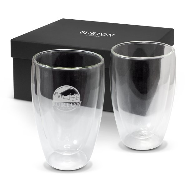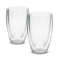 Exquisite set of two 410ml double wall glasses which are presented in a black gift box. They are manufactured from borosilicate glass which is incredibly light and very strong. The double wall construction keeps drinks hot for longer while the outside of the glass remains comfortable to hold and it keeps drinks cold without messy condensation. They are ideal for use as on-trend coffee cups or for serving icy cold beverages. Tivoli glasses are also great for frozen desserts which need to stay frozen for as long as possible. This product is not dishwasher safe and handwashing is recommended. Packed in gift black box. Colours: Clear. Dimensions: Glass: Dia 90mm x H 138mm. Gift Box:W 185mm x L 242mm x 100mm.
