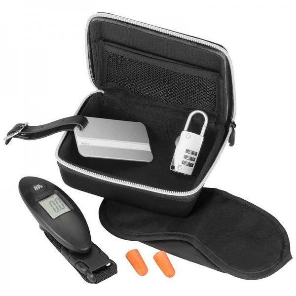 The perfect travel companion. Comes in a durable PVC case with luggage scales, luggage tag, luggage lock, eye mask and ear buds. Colours: Black. Dimensions: case: 140mm(w) x 110mm(h) x 50mm(d).