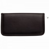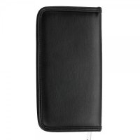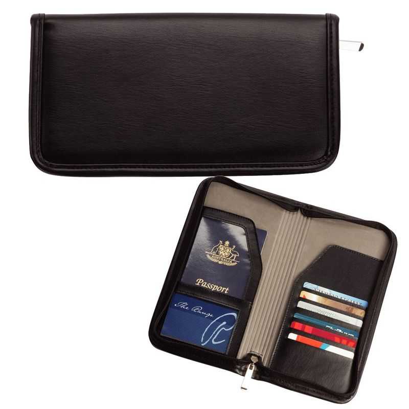 Zippered travel wallet made from black koskin material with grey EVA interior. Includes internal pockets and sections for business cards. Colours: Black. Dimensions: 245mm(h) x 135mm(w) x 30mm(d).