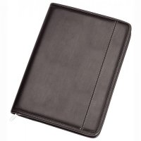 A4 size zippered compendium in koskin leather-look material with white stitching and grey EVA material contrast panels inside. Includes internal gusseted pocket, 3 pen loops, business card holder and white lined pad which inserts from the top. Pens not included. Colours: Black. Dimensions: 270mm(w) x 370mm(h) x 38mm(d).