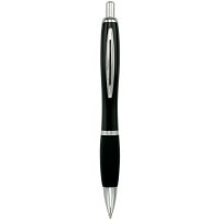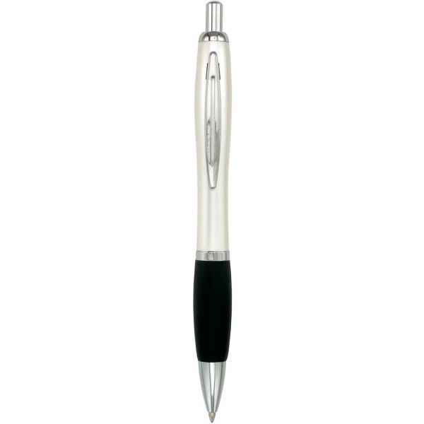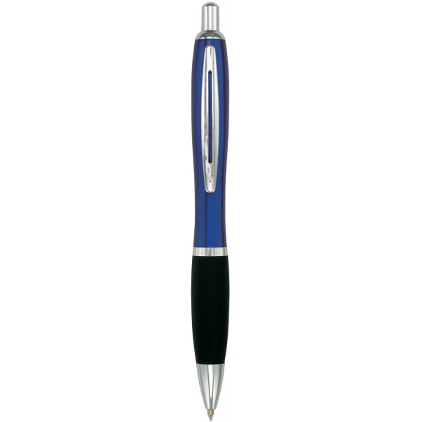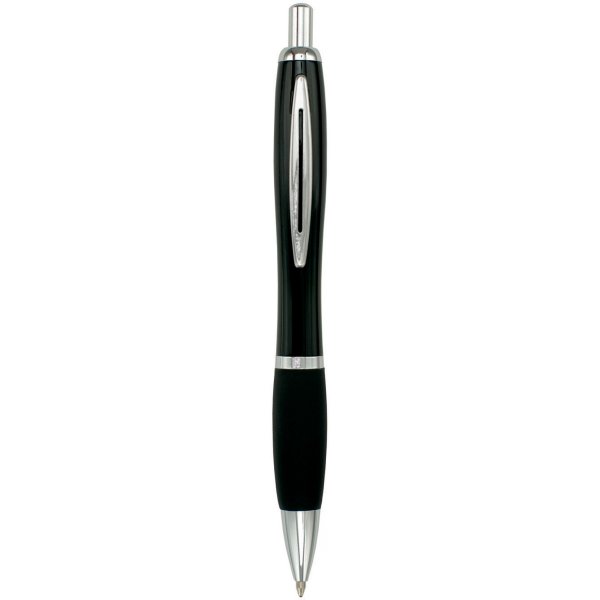 This metal pen has a curvy coloured barrel with a black rubber grip and silver fittings. Parker style black refill. Colours: black, blue, red, silver.