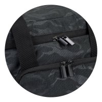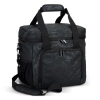 Practical 17L cooler bag manufactured from 300D polyester with a stylised camouflage pattern. The bag has thick PE foam insulation encased in a water-resistant PEVA inner liner. It features an adjustable shoulder strap, a zippered front pocket, two mesh side pockets, and carry handles with a velcro cuff. Colours: Black. Dimensions: Bag: H 270mm x W 280mm x Gusset 220mm (excludes handles). Handle Length: 590mm. Strap Length (extended): 1330mm.