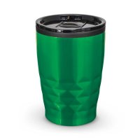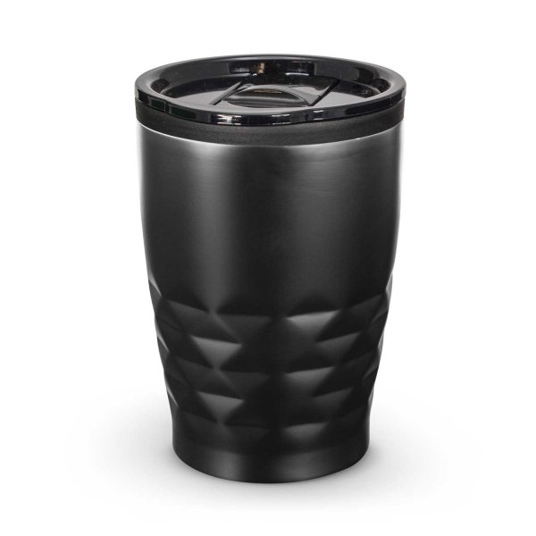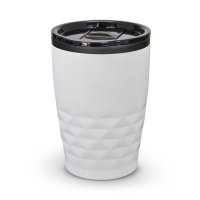 Trendy 400ml double wall coffee cup which will keep drinks hot for longer. It has a smart diamond patterned stainless steel outer wall and a polypropylene inner wall. Urban has a secure plastic push on lid with a splashproof sliding closure and a soft non-marking base. It is BPA-free and laser engraves to a shiny steel finish except for the silver colour, which engraves to a natural etch. An optional black gift box is available on request. This product is not dishwasher safe and handwashing is recommended. For optional Non Woven 4 Coffee Cups Carry Bag at additional cost, please click here.