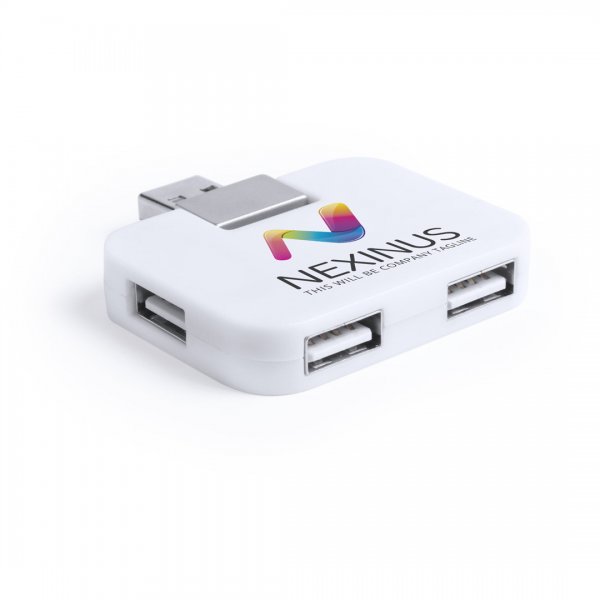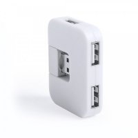 Minimalist design USB 2.0 hub in white color. With 4 USB ports and large printing area. Presented in an individual silver plated box. Colours: White. Dimensions: 5.2 x 1 x 4.1 cm.