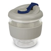 Exquisite 230ml double wall borosilicate glass coffee cup with a secure push-on polypropylene lid with silicone swivel closure and a wide heat-resistant silicone band. Borosilicate glass is incredibly light and very strong. The double wall construction keeps drinks hot for longer while the outside of the glass remains comfortable to hold. The silicone flip closure can come in any colour from the standard colours at no extra cost. Up to five different colour combinations are included in the price and more are available for an additional charge. This product is not dishwasher safe and handwashing is recommended. Dimensions: Dia 93mm x H 109mm. Gift Box: H 115mm x W 97mm x 96mm.