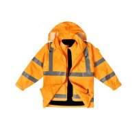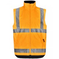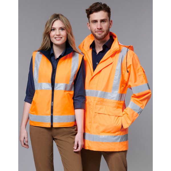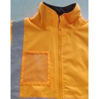 A waterproof oxford shell with mesh lining Jacket and a reversible vest with waterproof oxford face shell with polar fleece on reverse side. Breathability: 3000mm, Water Proof: 8000mm. Optional clear ID pocket to be sewn on right hand chest (extra charge), Bio Motion Reflective tape, Day/Night AS/NZS 4602.1:2011. Colours: Orange. Sizes: 8 10 12 14 16 18 20 22 24/26 28/30 (from 2XS to 7XL).