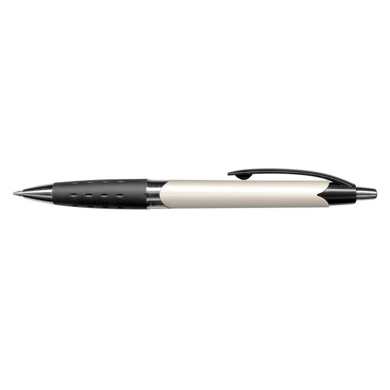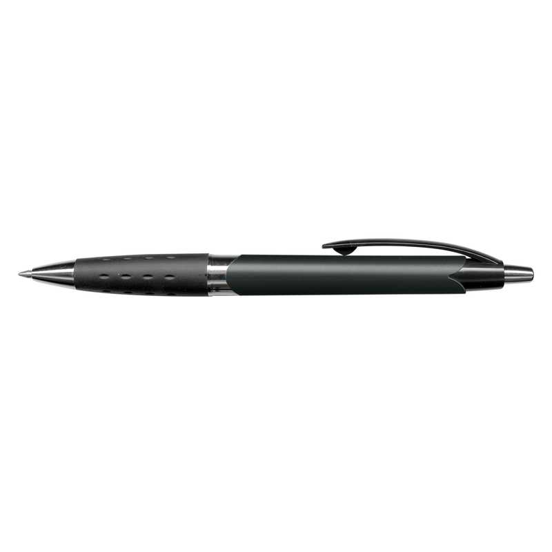 Retractable plastic and metal ball pen with a metallic barrel and a soft rubber grip. It has a blue refill with 1200 metres of writing ink.