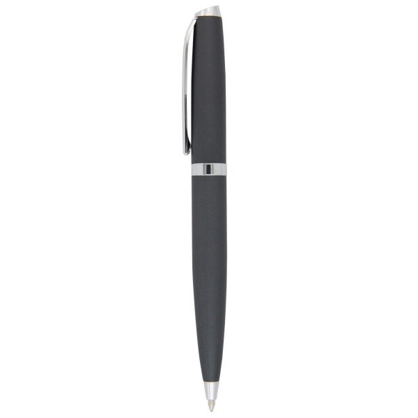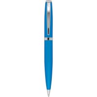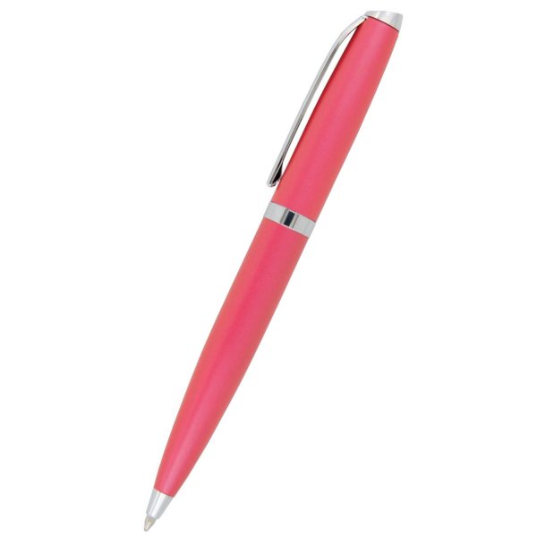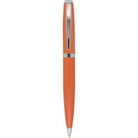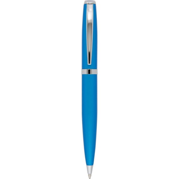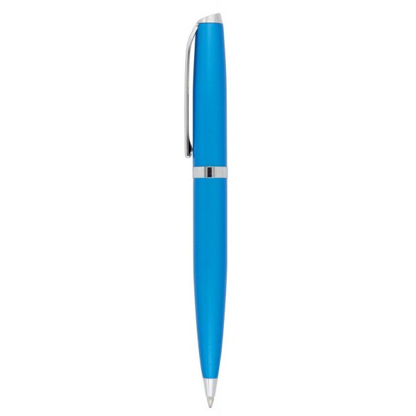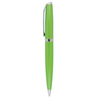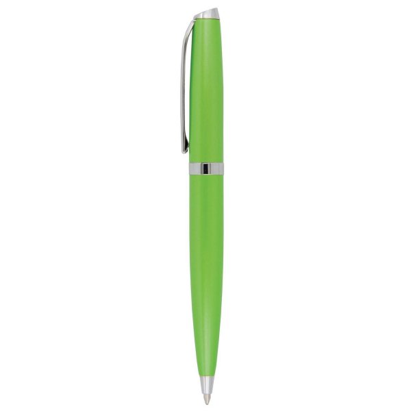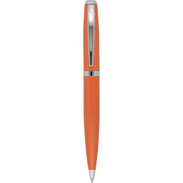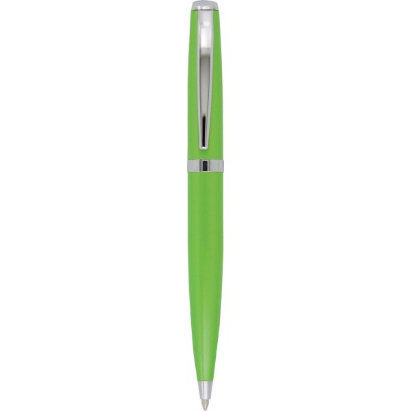 Stylish twist action metal ball pen in vibrant contemporary colours with shiny silver clip and trim. Parker style black refill. Colours: black, blue, green, orange, pink, purple, red, silver, yellow.