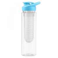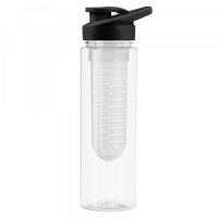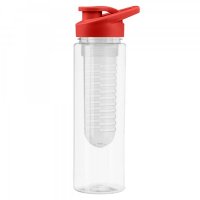 700ml transparent plastic drink bottle with fruit infuser, it is manufactured from Tritan material which is strong and tough, BPA free, has a secure screw on lid with carry handle and flip out drinking nozzle, it is not dishwasher safe and handwashing is recommended. Not intended for use with hot liquids or carbonated beverages, do not subject to high temperatures for long period of time, do not boil or fill bottle with boiling water. Colours: Transparent/Black, Transparent/Blue, Transparent/Red. Dimensions: 235mmH x 85mmD.