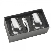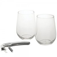 Two piece wine glass set with waiters friend. This set is beautifully boxed in a black two piece gift box with foam insert. 450ml capacity. Colours: Clear. Dimensions: Glasses 114mm(h) x 88mm Ø, Waiters friend 118mm(w) x 33mm(h) x 12mm(d), Box 270mm(w) x 150mm.